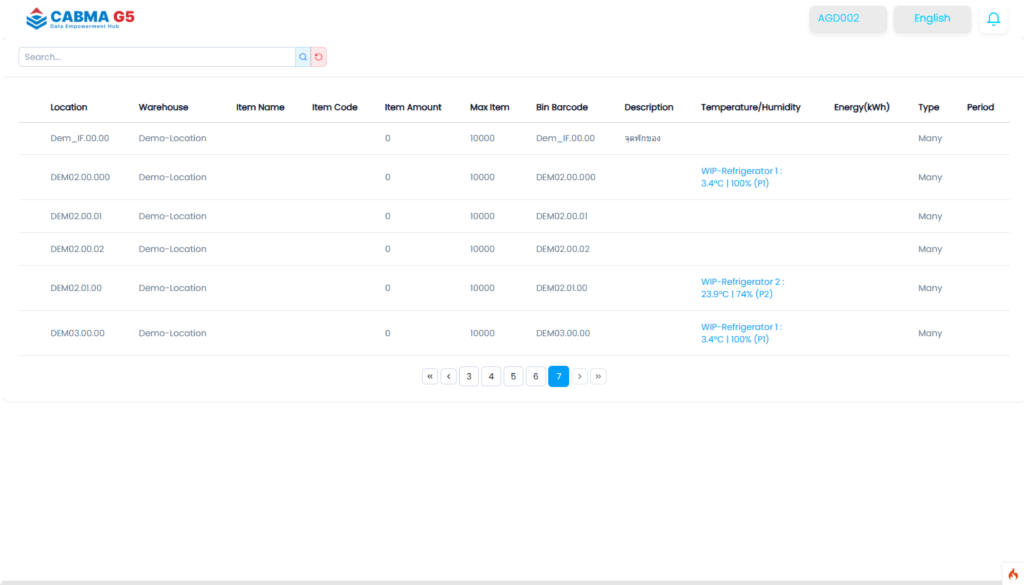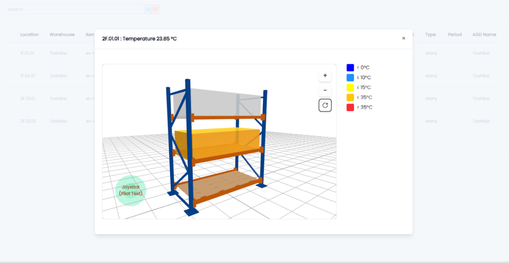 CABMA-MCI แสดงข้อมูลพื้นที่จัดเก็บสินค้า (Bin) ในรูปแบบ 3D Visualization ที่สามารถหมุนดูได้รอบทิศทาง 360 องศา ผู้ใช้งานสามารถเห็นภาพจริงของพื้นที่จัดเก็บ พร้อมแถบสีแสดงอุณหภูมิของแต่ละ Bin ทำให้เข้าใจสถานะพื้นที่ได้ทันทีโดยไม่ต้องตีความจากตัวเลขเพียงอย่างเดียว